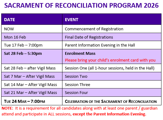 Sacrament of Holy Communion sessions will be held in the Hall, after each Vigil Mass.